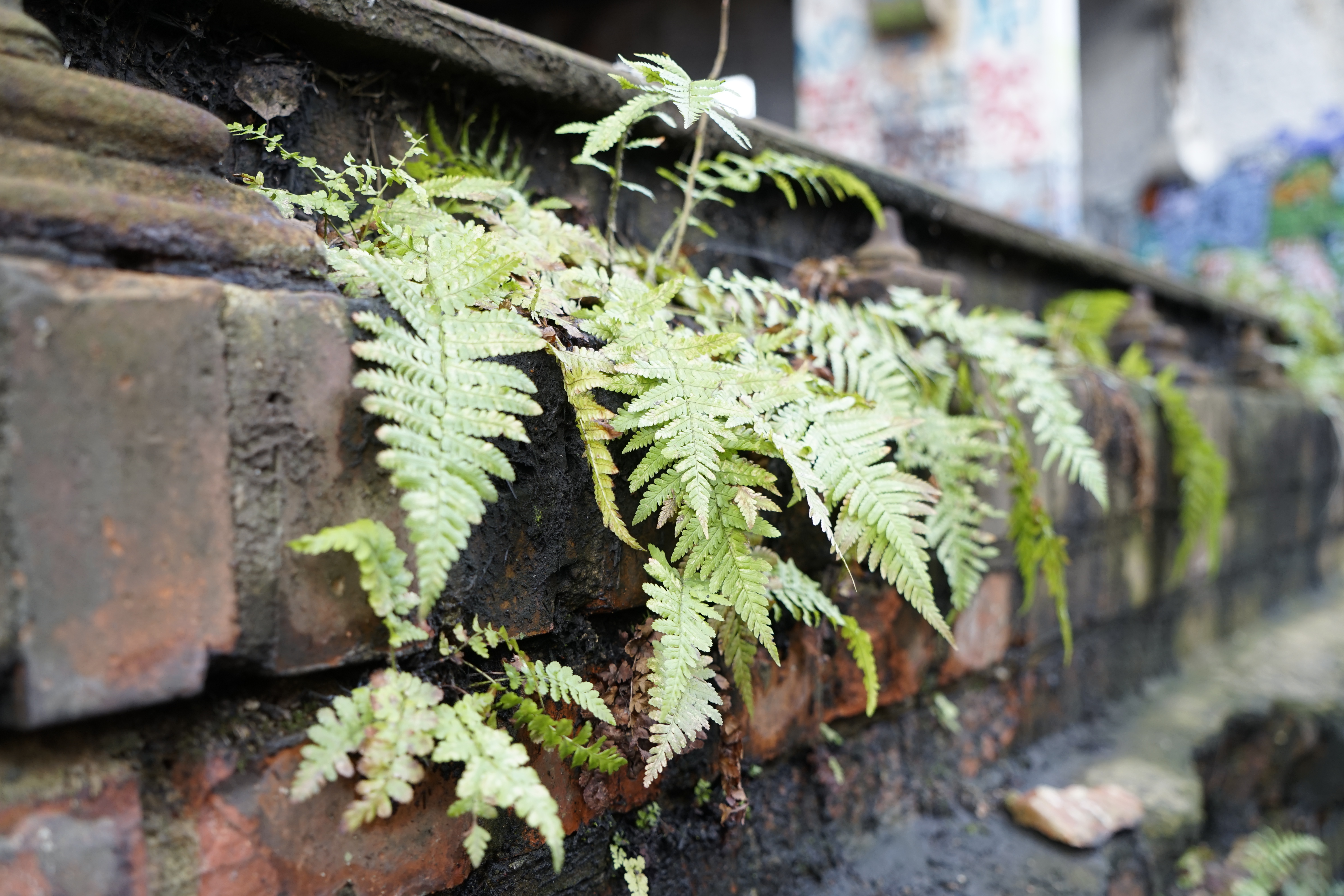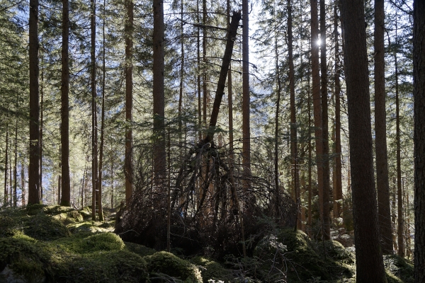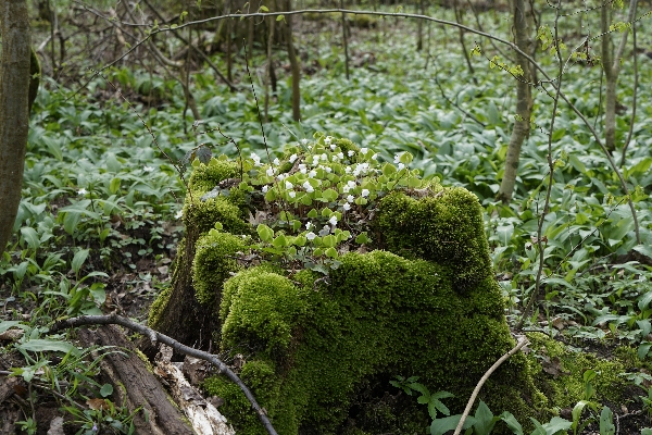 A mossy trunk with white flowers on it. Endless fields of wild garlic in the background.